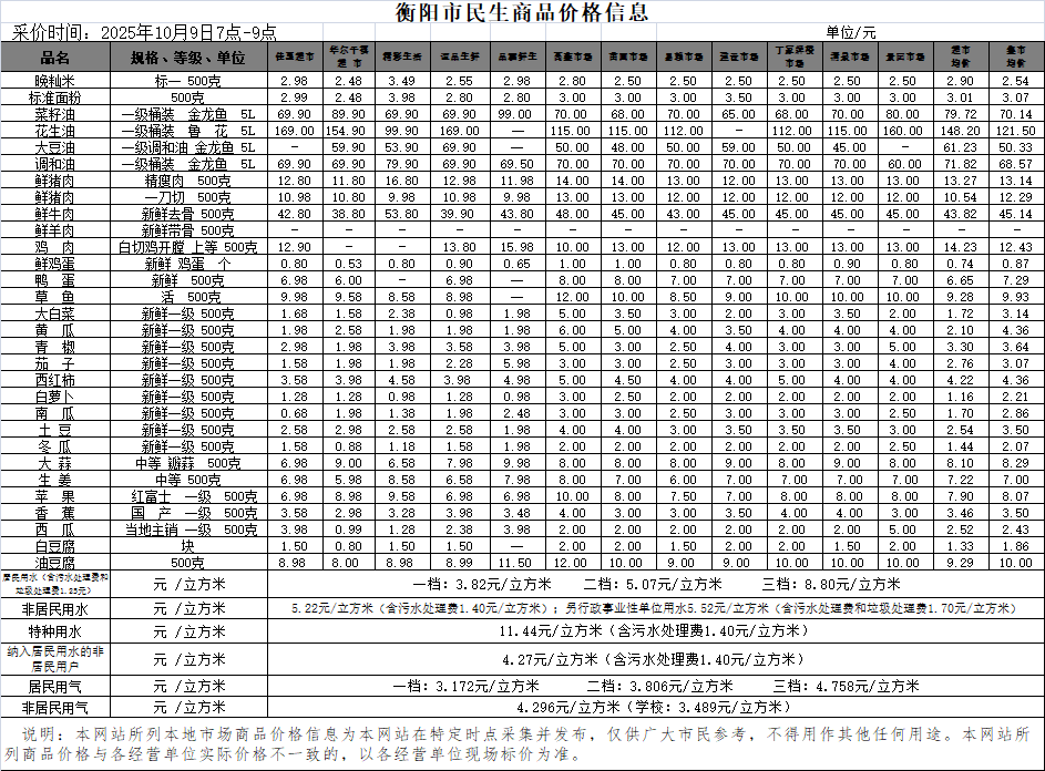 【物价】 2025-10-9衡阳市民生价格信息